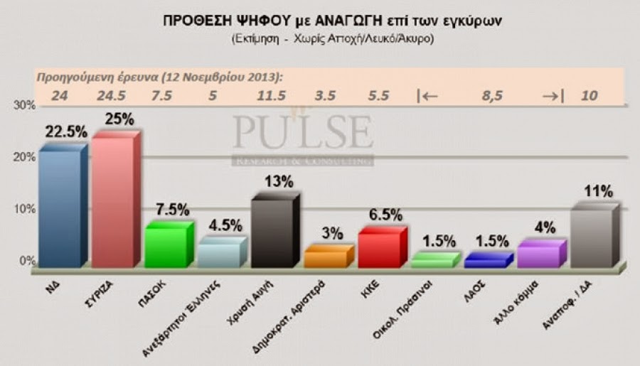 Σε προηγούμενη έρευνα που είχε γίνει από την ίδια εταιρεία στις 12 Νοεμβρίου, ο ΣΥΡΙΖΑ συγκέντρωνε 24,5%, η ΝΔ 24% και η Χρυσή Αυγή 11,5%. Οι αναποφάσιστοι αγγίζουν το 11% από το 10% που συγκέντρωναν στις 12 Νοεμβρίου.
