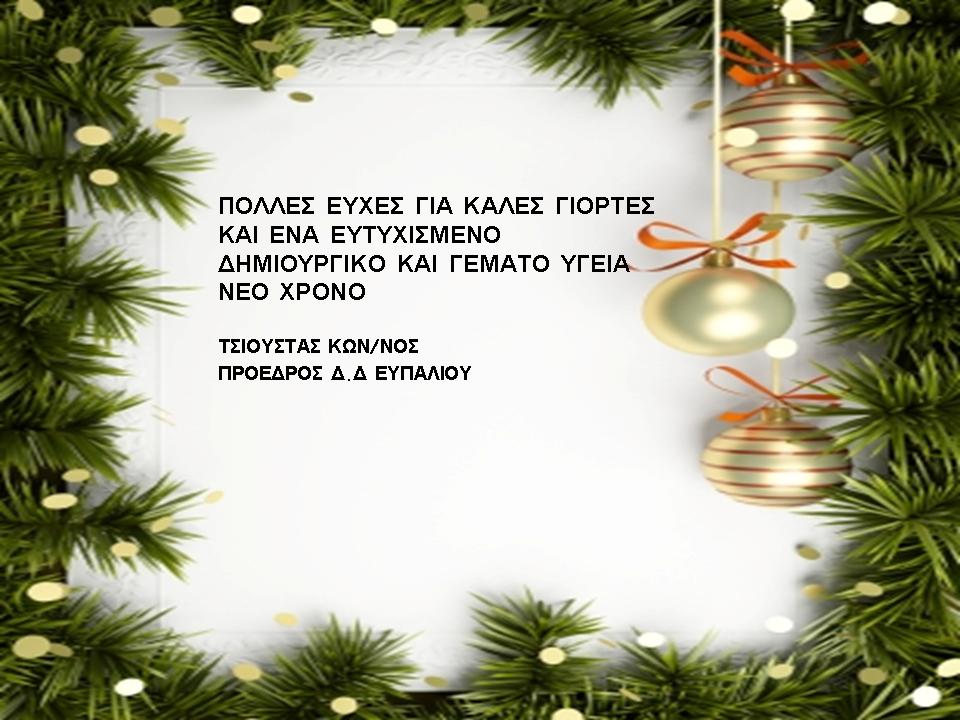 Ευχές από τον Πρόεδρο του Ευπαλίου Κωνσταντίνο Τσιούστα Χωρίς κατηγορία Από DoridaNews Team Στις Δεκ 23, 2015 Share - Διαφήμιση -Χρόνος ανάγνωσης: 4 λεπτά Συνεχίστε να διαβάσετε- Διαφήμιση - Share