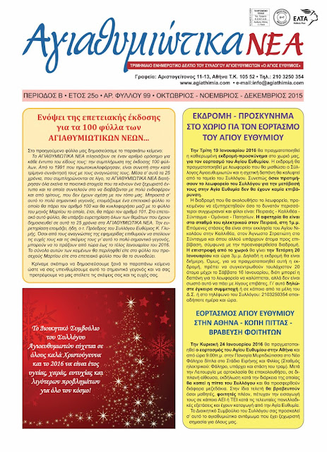 - Νέα για τον Σύλλογο Αγιοευθυμιωτών (Εκδρομή-προσκύνημα στο χωριό για τον εορτασμό του Αγίου Ευθυμίου, Κοπή πίτας-βράβευση φοιτητών και εορτασμός του Αγίου Ευθυμίου στην Αθήνα και Προετοιμασία της Επετειακής έκδοσης για τα 100 φύλλα των ΑΓΙΑΘΥΜΙΩΤΙΚΩΝ ΝΕΩΝ).