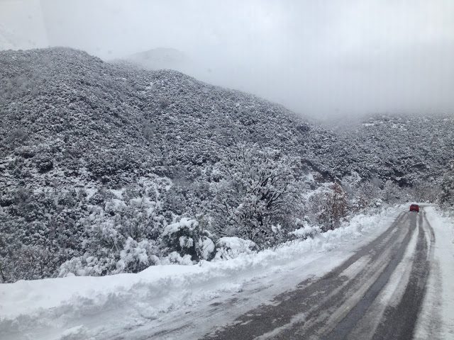 Η διακίνηση στο ορεινό οδικό δίκτυο γίνεται με δυσκολία και πάντως με αντιολισθητικές αλυσίδες, παρότι τα εκχιονιστικά μηχανήματα του Δήμου βρίσκονται σε συναγερμό για να κρατήσουν όσο μπορούν περισσότερο το δίκτυο ανοιχτό.