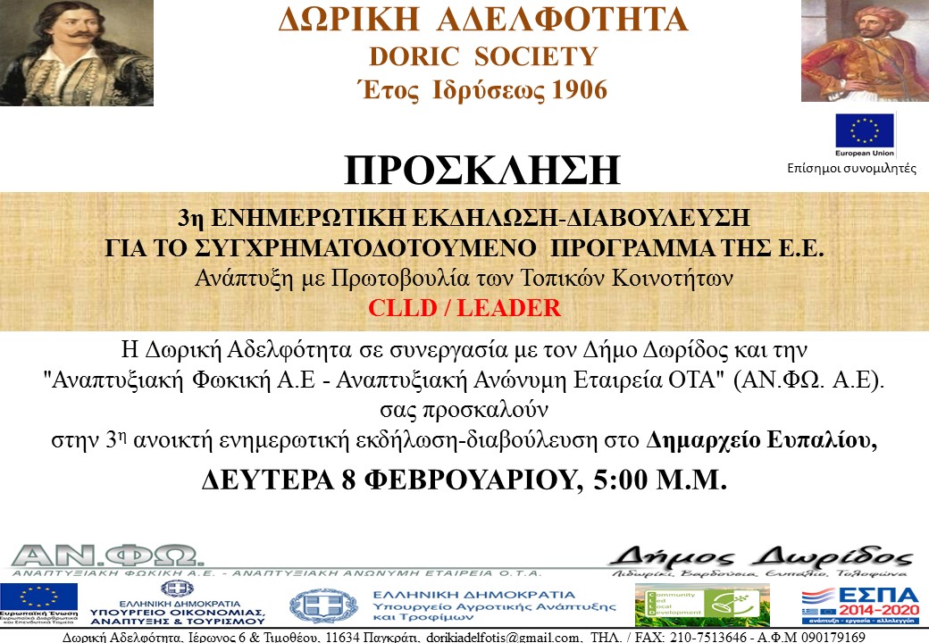 Η Τοπική Ανάπτυξη με πρωτοβουλία Τοπικών Κοινοτήτων (CLLD) 2014-2020, βασισμένη στην προσέγγιση LEADER, είναι μια μέθοδος σχεδιασμού και υλοποίησης τοπικών ολοκληρωμένων αναπτυξιακών στρατηγικών, με τη συμμετοχή των εταίρων σε τοπικό επίπεδο, συμπεριλαμβανομένης της κοινωνίας των πολιτών , των τοπικών οικονομικών και κοινωνικών φορέων, προκειμένου να αντιμετωπισθούν αποτελεσματικά οι οικονομικές, κοινωνικές, περιβαλλοντικές και δημογραφικές προκλήσεις που αντιμετωπίζουν οι αγροτικές περιοχές.