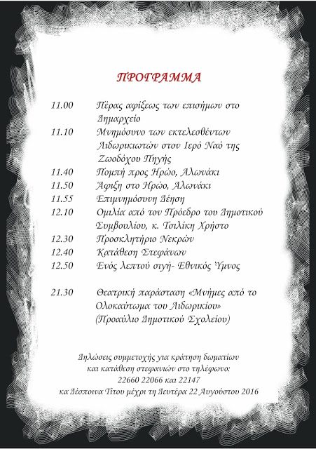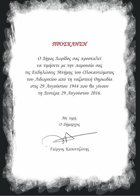 ΟΛΟΚΑΥΤΩΜΑ ΛΙΔΩΡΙΚΙΟΥ: Εκδηλώσεις Μνήμης του Δήμου, Δευτέρα 29 Αυγούστου Χωρίς κατηγορία Από DoridaNews Team Στις Αυγ 11, 2016 Share - Διαφήμιση -Χρόνος ανάγνωσης: 14 λεπτά Συνεχίστε να διαβάσετε- Διαφήμιση - Share