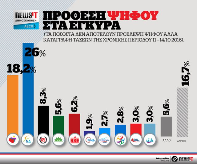 Η διαφορά ανάμεσα στα δυο κόμματα φαίνεται να διευρύνεται αφού στην προηγούμενη δημοσκόπηση της Alco, η ΝΔ ήταν μπροστά με 21,3% έναντι 15,5%. του ΣΥΡΙΖΑ. Δηλαδή η διαφορά ήταν στο 5,8%.