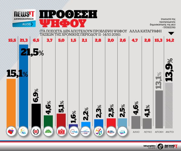 Μικρό άνοιγμα της ψαλίδας υπέρ της  Ν.Δ από τον ΣΥΡΙΖΑ έδειξε η νέα δημοσκόπηση της Alco που έγινε από τις 11 έως τις 14 Οκτωβρίου σε δείγμα 1.000 ατόμων.