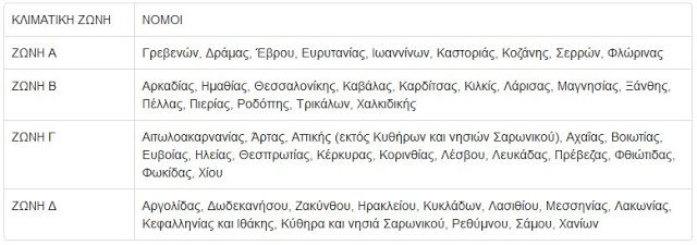 Για τη χορήγηση του επιδόματος θέρμανσης, η Ελληνική Επικράτεια κατανέμεται σε τέσσερις κλιματικές ζώνες, ως ακολούθως