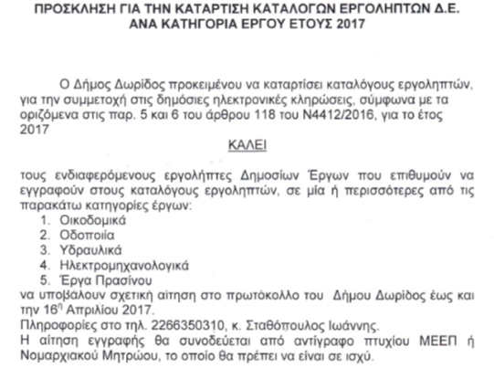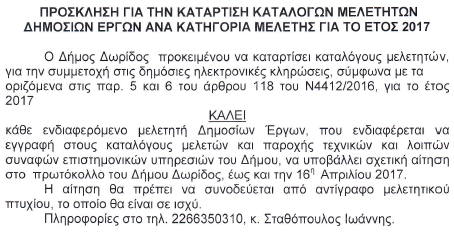 Ο Δήμος Δωρίδας προχωρά στην κατάρτιση καταλόγου εργοληπτών και μελετητών και ζητά από τους ενδιαφερόμενους να δηλώσουν συμμετοχή με πρόσκληση του Δημάρχου Γιώργου Καπεντζώνη