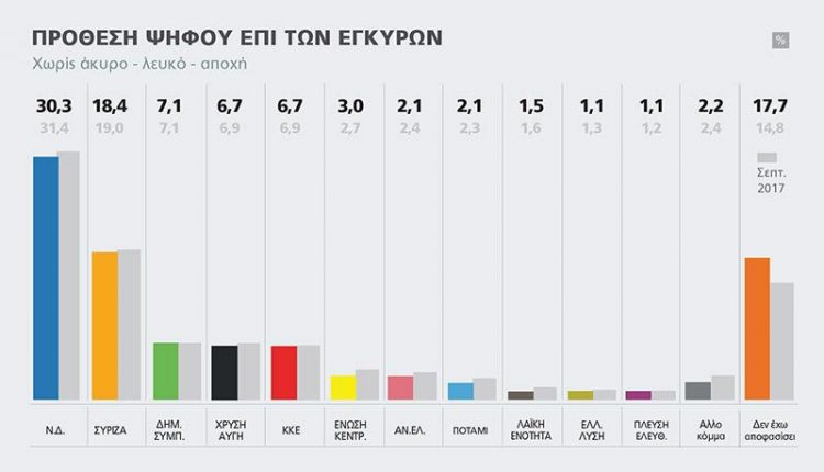 Δημοσκόπηση : Με 11,9 μονάδες μπροστά η ΝΔ -30,3% έναντι 18,4% του ΣΥΡΙΖΑ