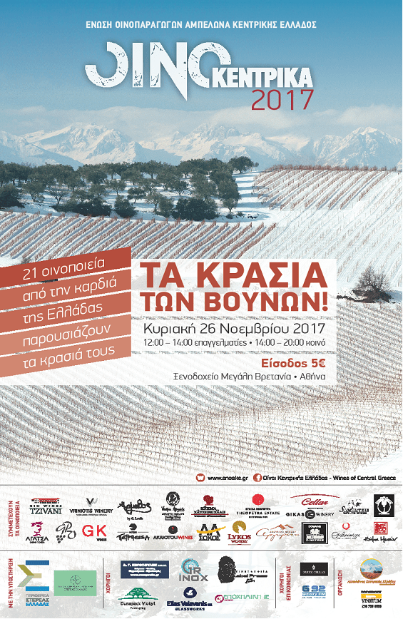 Ακόμη μία δράση προβολής και προώθησης του πρωτογενούς τομέα παραγωγής και των προϊόντων της Στερεάς Ελλάδας στηρίζει εμπράκτως η Περιφέρεια. Οι οινοπαραγωγοί της Στερεάς Ελλάδας συμμετέχουν στην εκδήλωση γευσιγνωσίας «Οινοκεντρικά» που θα πραγματοποιηθεί στο ξενοδοχείο «Μεγάλη Βρεταννία» την Κυριακή 26 Νοεμβρίου 2017, με ώρες λειτουργίας 12:00 – 16:00 για τους επαγγελματίες και 14:00 – 20:00 για τους καταναλωτές. Την εκδήλωση συνδιοργανώνουν η «Αγροδιατροφική Σύμπραξη Στερεάς Ελλάδας», η Περιφέρεια Στερεάς Ελλάδας και η ΕΝΟΑΚΕ.