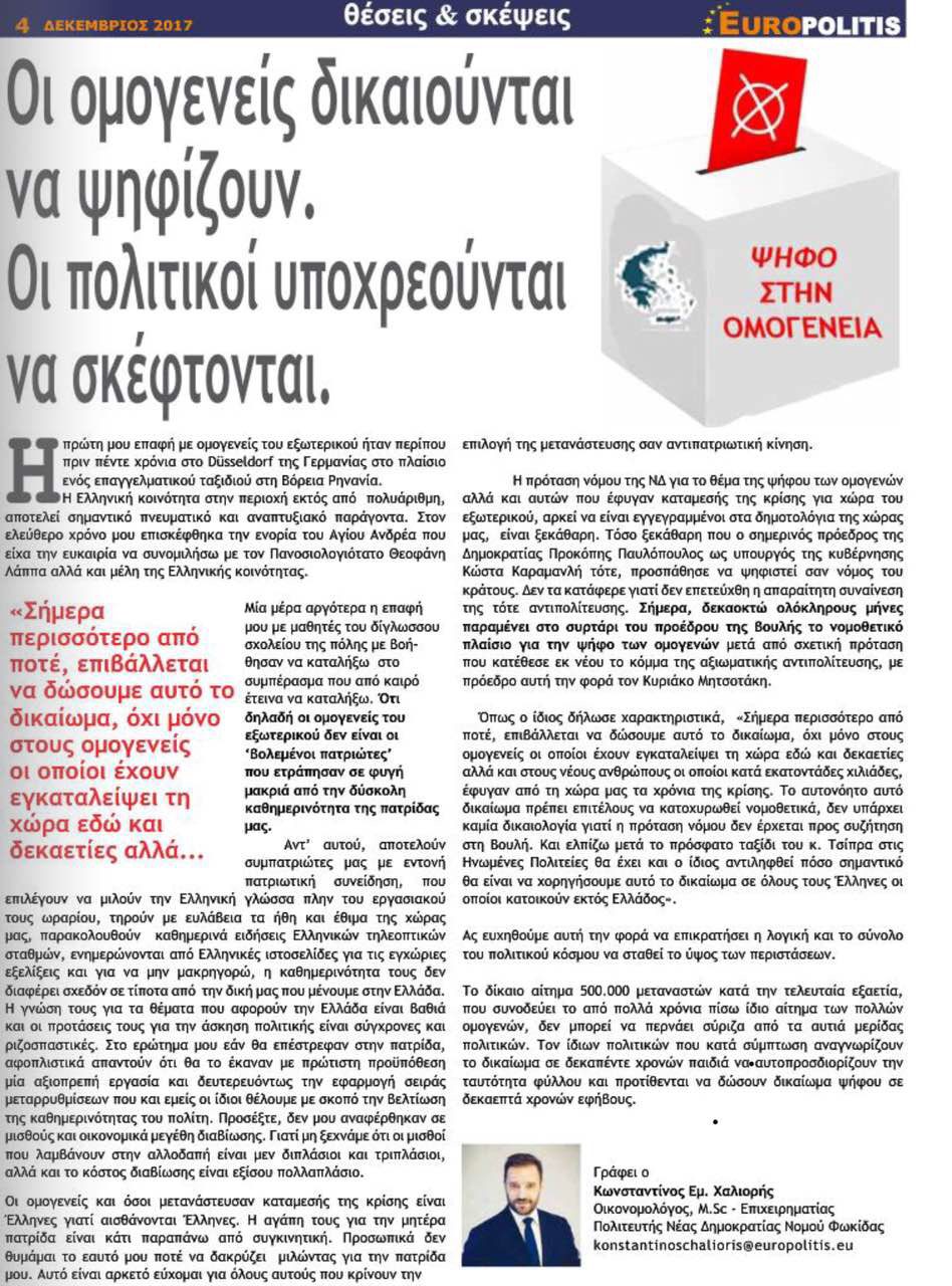* Το άρθρο δημοσιεύτηκε στην εφημερίδα EUROPOLITIS , την μεγαλύτερη σε κυκλοφορία και αναγνωσιμότητα εφημερίδα των ομογενών στην Ευρώπη