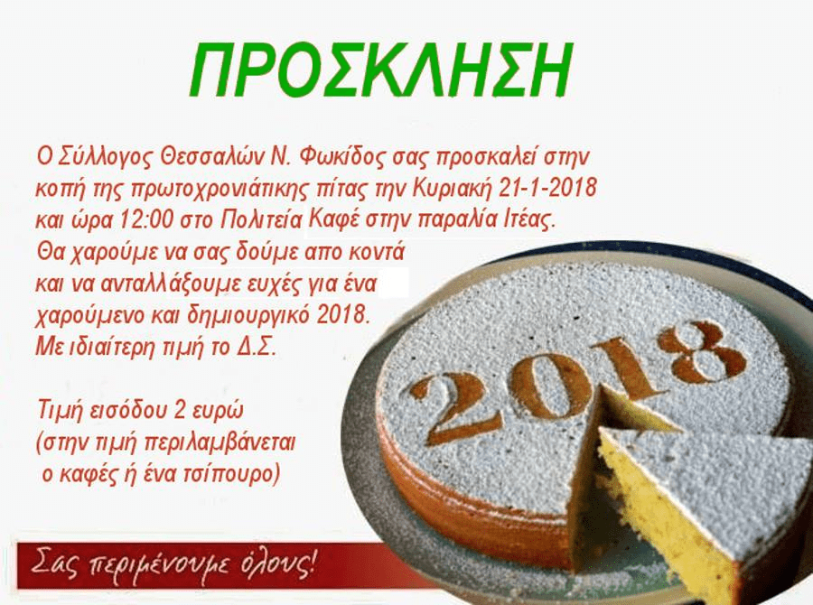 Πίτα του Συλλόγου Θεσσαλών στο Νομό Φωκίδας ΚΟΙΝΩΝΙΚΑ Από doridanews Στις Ιαν 15, 2018 Share - Διαφήμιση -Χρόνος ανάγνωσης: 1 λεπτό Συνεχίστε να διαβάσετε- Διαφήμιση - Share