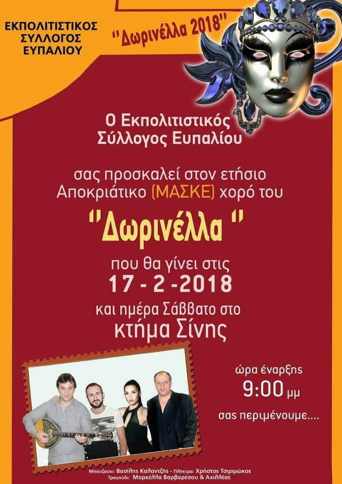 Την προηγούμενη βραδιά o Πολιτιστικός Σύλλογος Ευπαλίου πραγματοποιεί τον Αποκριάτικο Μασκέ χορό “Δωρινέλλα 2018” στο “Κτήμα Σίνη” πρώην Κοπακαμπάνα στη Δάφνη.