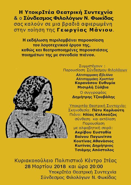 Η ΥποκρΙτέα Θεατρική Συντεχνία και ο Σύνδεσμος Φιλολόγων Νομού Φωκίδας σας καλούν σε μια βραδιά αφιερωμένη στην ποίηση της Γεωργίας Μάνιου.