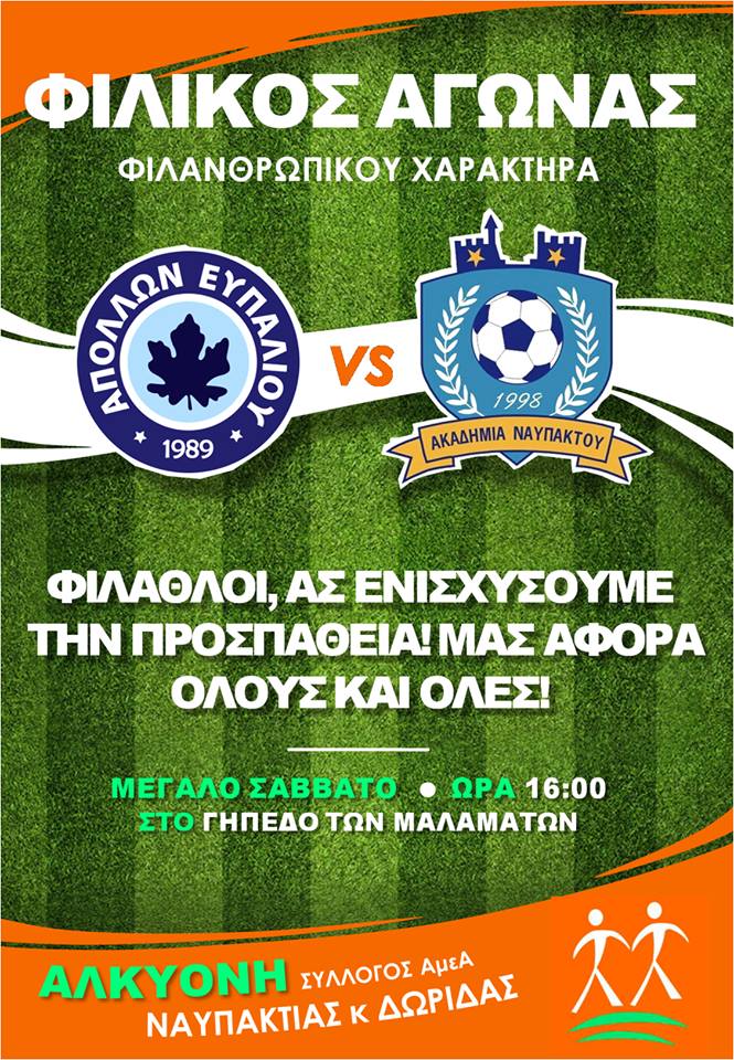 Σήμερα ο αγώνας Απόλλωνα Ευπαλίου – Ακαδημία Ναυπάκτου για φιλανθρωπικό σκοπό ΑΘΛΗΤΙΣΜΟΣ Από doridanews Στις Απρ 7, 2018 Share - Διαφήμιση -Χρόνος ανάγνωσης: 1 λεπτό Συνεχίστε να διαβάσετε- Διαφήμιση - Share