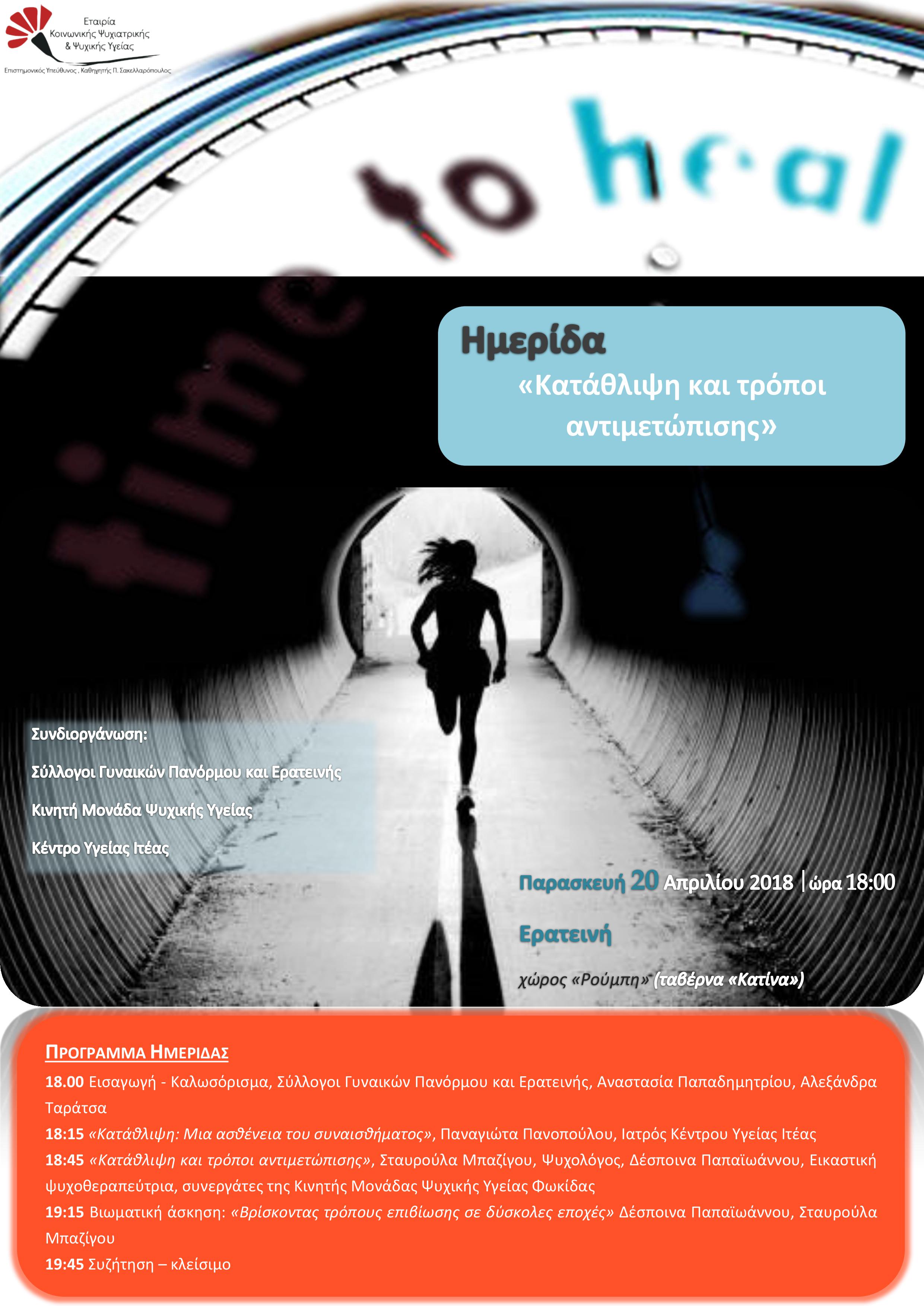 Ενημερωτική ημερίδα γύρω από το επίκαιρο και μείζον κοινωνικό θέμα «Κατάθλιψη και τρόποι αντιμετώπισης» διοργανώνουν οι Σύλλογοι Γυναικών Πανόρμου και Ερατεινής σε συνεργασία με την Κινητή Μονάδα Ψυχικής Υγείας Ν. Φωκίδας της Εταιρίας Κοινωνικής Ψυχιατρικής και Ψυχικής Υγείας και το Κέντρο Υγείας Ιτέας την Παρασκευή 20 Απριλίου και ώρα 18:00 στο χώρο «Ρούμπη» της ταβέρνας «Κατίνα» στην Ερατεινή.