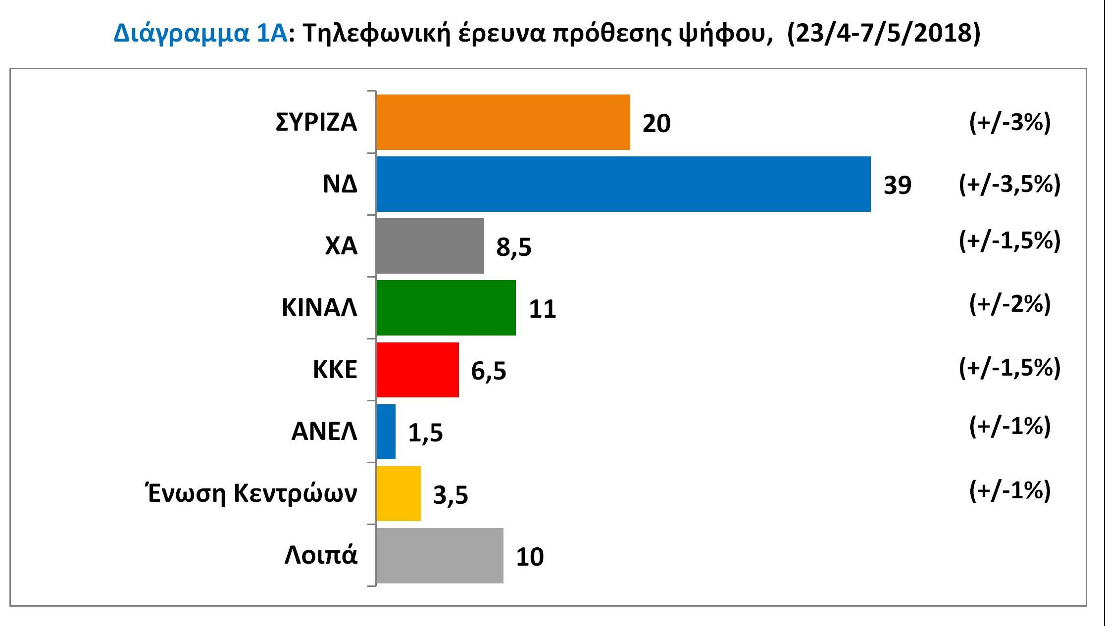 Το κόμμα του Κυριάκου Μητσοτάκη συγκεντρώνει ποσοστό της τάξης του 39% και του Αλέξης Τσίπρα 20%. Πρόκειται για επαναφορά της διαφοράς σε ιστορικά υψηλά επίπεδα, όπως σημειώνουν οι αναλυτές της Public Issue.