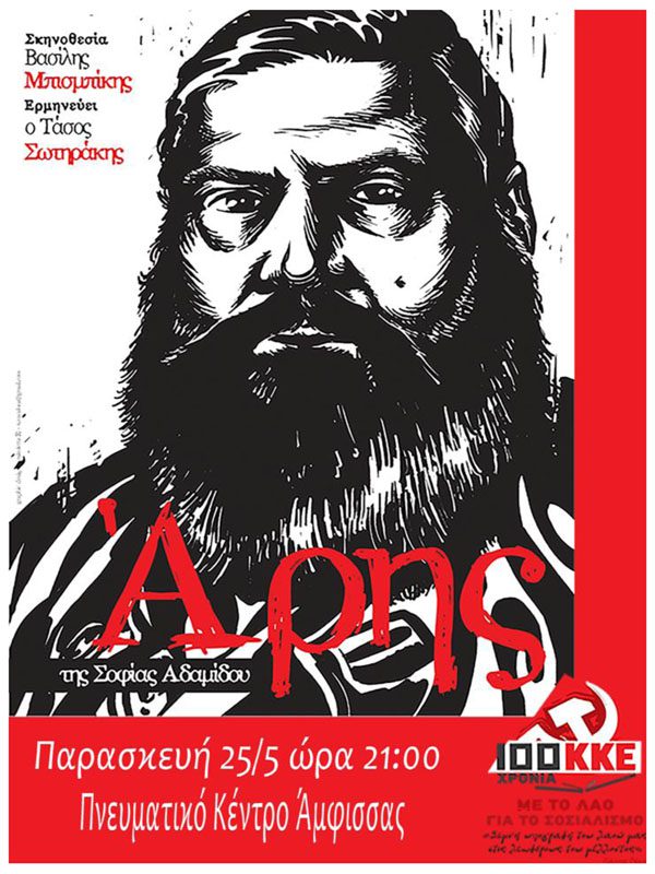 Η Κομματική Οργάνωση Φωκίδας του ΚΚΕ, στο πλαίσιο του εορτασμού των 100 χρόνων του Κόμματος, σας προσκαλεί στη θεατρική παράσταση «Άρης», που θα παρουσιαστεί την Παρασκευή 25 Μάη και ώρα 9:00μμ, στο Πνευματικό Κέντρο Άμφισσας.