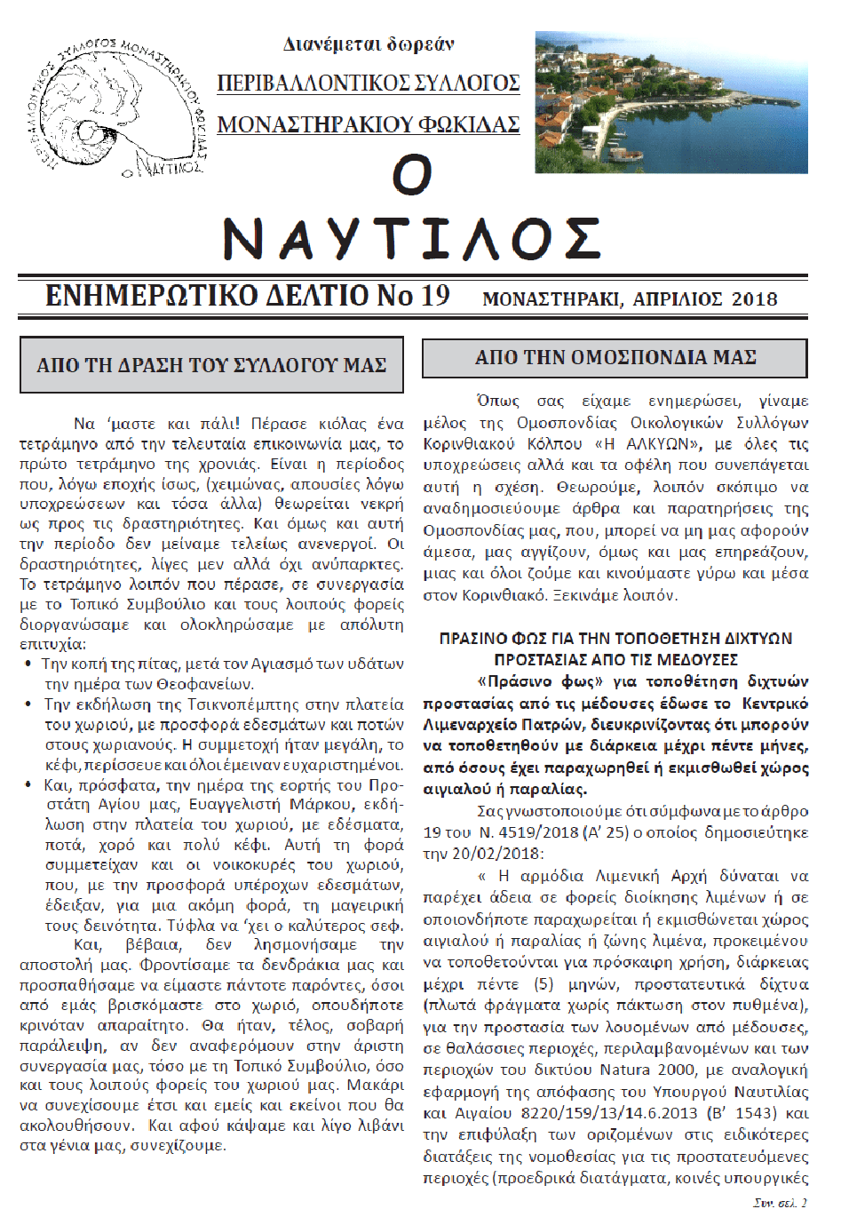 Με ενδιαφέρουσα ύλη γύρω από οικολογικά, περιβαλλοντικά και άλλα θέματα κυκλοφόρησε το νέο ενημερωτικό Δελτίο “ο Ναυτίλος” που εκδίδει και διανέμει δωρεάν ο Περιβαλλοντικός Σύλλογος  Μοναστηρακίου Δωρίδος.