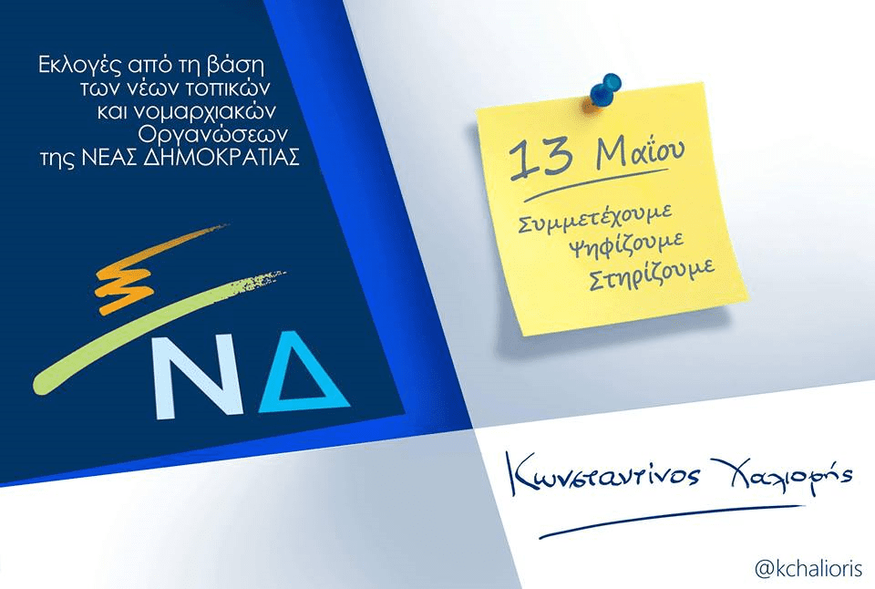 Με αφορμή τις επερχόμενες εκλογές που θα διεξαχθούν στις 13 Μαΐου με σκοπό την ανάδειξη προέδρων και μελών στις τοπικές και νομαρχιακή οργάνωση της ΝΔ στην Φωκίδα, θα ήθελα να ευχηθώ σε όλους τους υποψήφιους καλή επιτυχία και να εκφράσω παράλληλα την ικανοποίηση μου για την ποιότητα των ανθρώπων που επέλεξαν να διεκδικήσουν μια θέση στα όργανα του κόμματος.