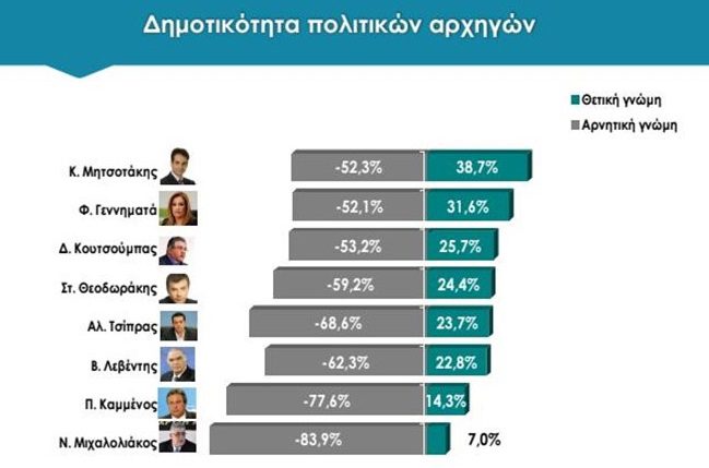 Στη δημοτικότητα των πολιτικών αρχηγών προηγείται ο Κυριάκος Μητσοτάκης με 38,7%, ακολουθεί η Φώφη Γεννηματά με 31,6%