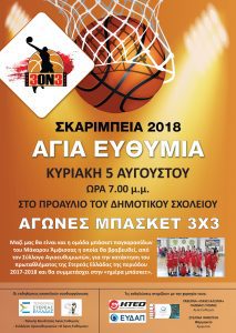 Ημέρα μπάσκετ η Κυριακή 5 Αυγούστου για τα ΣΚΑΡΙΜΠΕΙΑ 2018. Έτσι, από ώρα 7.00 μ.μ., στο προαύλιο του Δημοτικού Σχολείου της Αγίας Ευθυμίας, θα διεξαχθούν αγώνες μπάσκετ 3Χ3.