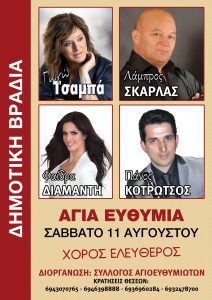 Στο πλαίσιο των εκδηλώσεων ΣΚΑΡΙΜΠΕΙΑ 2018, το Σάββατο 11 Αυγούστου 2018 και από ώρα 11 μ.μ., θα λάβει χώρα ΜΕΓΑΛΗ ΔΗΜΟΤΙΚΗ ΒΡΑΔΙΑ, στο προαύλιο του Δημοτικού Σχολείου της Αγίας Ευθυμίας.