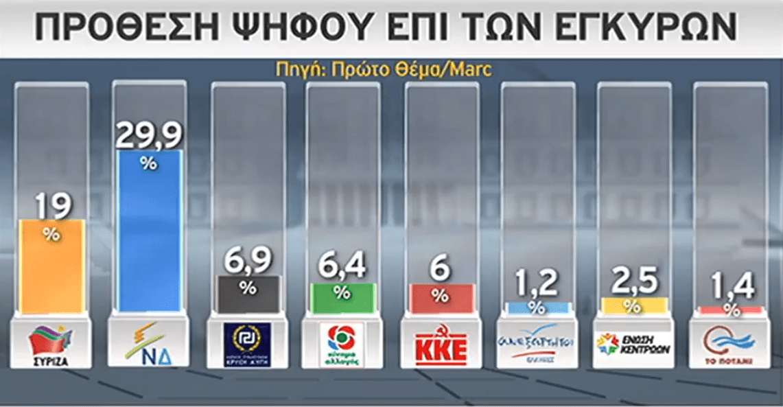 Στην δημοσκόπηση της Marc για λογαριασμό του «Πρώτου Θέματος» καταγράφεται το ξεκάθαρο προβάδισμα της Νέας Δημοκρατίας με 29,9%, έναντι 19% του ΣΥΡΙΖΑ.