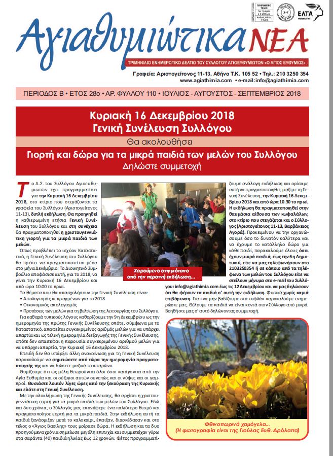 Πολυσέλιδο, με 56 (!!) έγχρωμες σελίδες και με πλούσιο περιεχόμενο, κυκλοφόρησε το φθινοπωρινό φύλλο (υπ’ αρ.110) των ΑΓΙΑΘΥΜΙΩΤΙΚΩΝ ΝΕΩΝ με κάποια καθυστέρηση λόγω της πολλής ύλης αλλά και των επαγγελματικών υποχρεώσεων του υπευθύνου της.