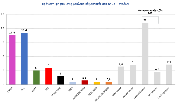 Σημαντικό είναι το ποσοστό των ψηφοφόρων που δηλώνουν αναποφάσιστοι (22%) ενώ πρόθεση να απέχουν από την επόμενη εκλογική διαδικασία είναι το 7,1% των δημοτών της Πάτρας.