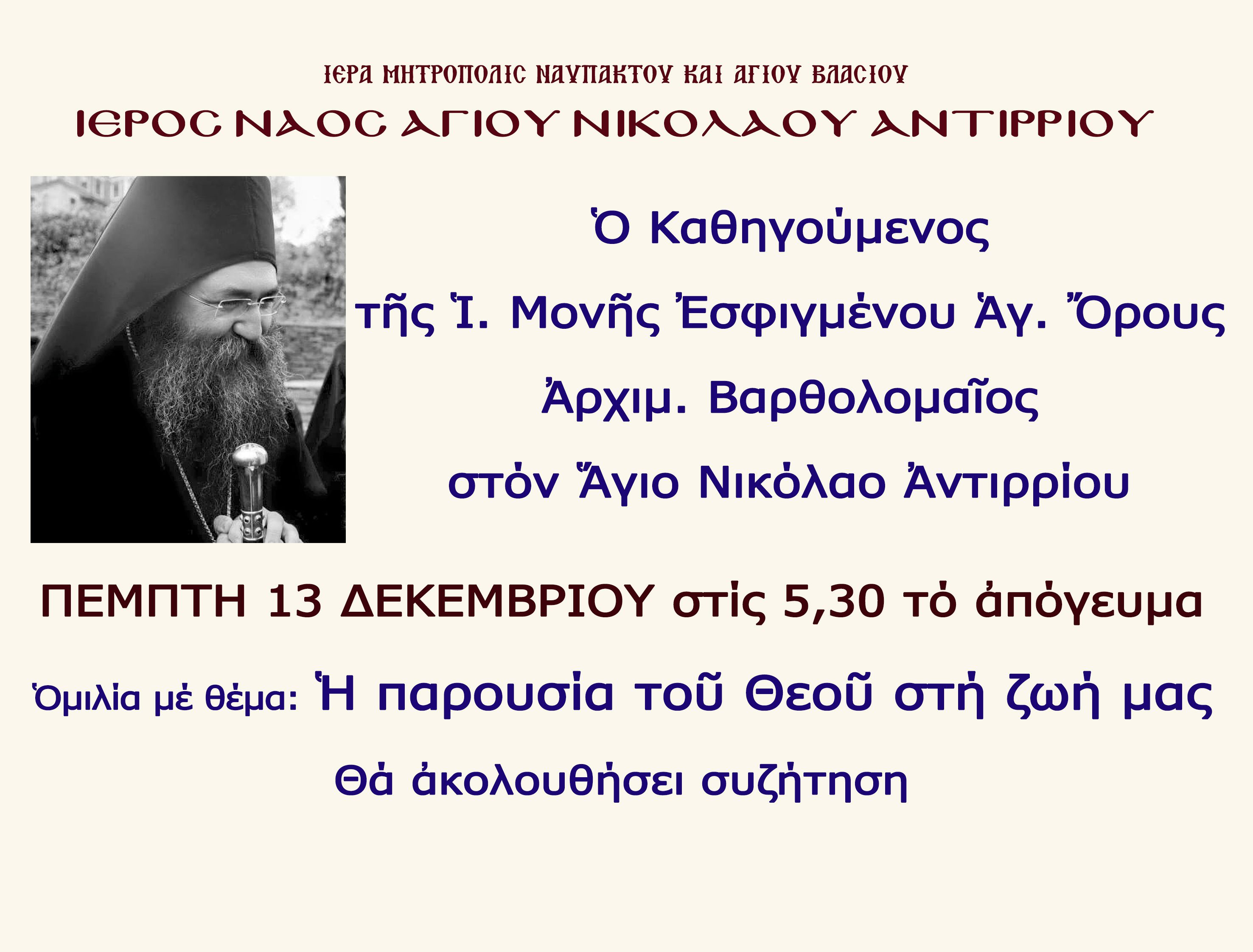 Ομιλία Αρχιμανδριτη Βαρθολομαίου της Ι.Μ.Εσφιγμένου του Αγίου Όρους στον Άγιο Νικόλαο Αντιρρίου ΚΟΙΝΩΝΙΚΑ Από doridanews Στις Δεκ 10, 2018 Share - Διαφήμιση -Χρόνος ανάγνωσης: 1 λεπτό Συνεχίστε να διαβάσετε- Διαφήμιση - Share