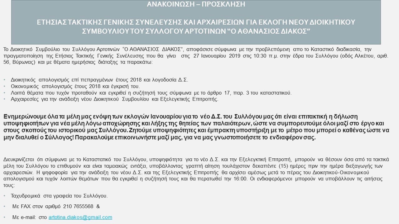 Γενική Συνέλευση και αρχαιρεσίες του Συλλόγου Αρτοτινών ΚΟΙΝΩΝΙΚΑ Από doridanews Στις Ιαν 22, 2019 Share - Διαφήμιση -Χρόνος ανάγνωσης: 1 λεπτό Συνεχίστε να διαβάσετε- Διαφήμιση - Share