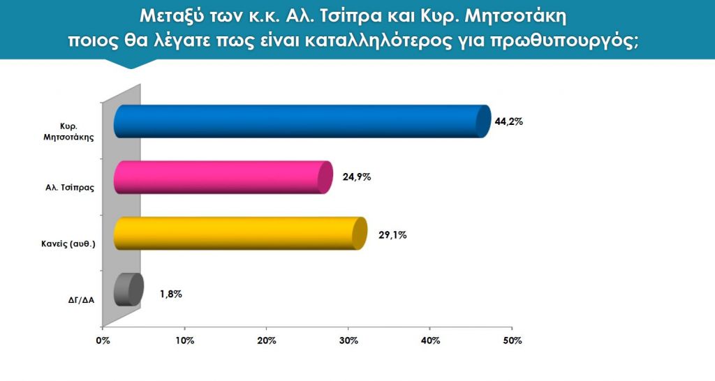 Στο ερώτημα ποιος είναι κατάλληλος για πρωθυπουργός το 44,2% λέει ο Κυριάκος Μητσοτάκης, το 24,9% ο Αλέξης Τσίπρας και το 29.1% κανείς από τους δύο.