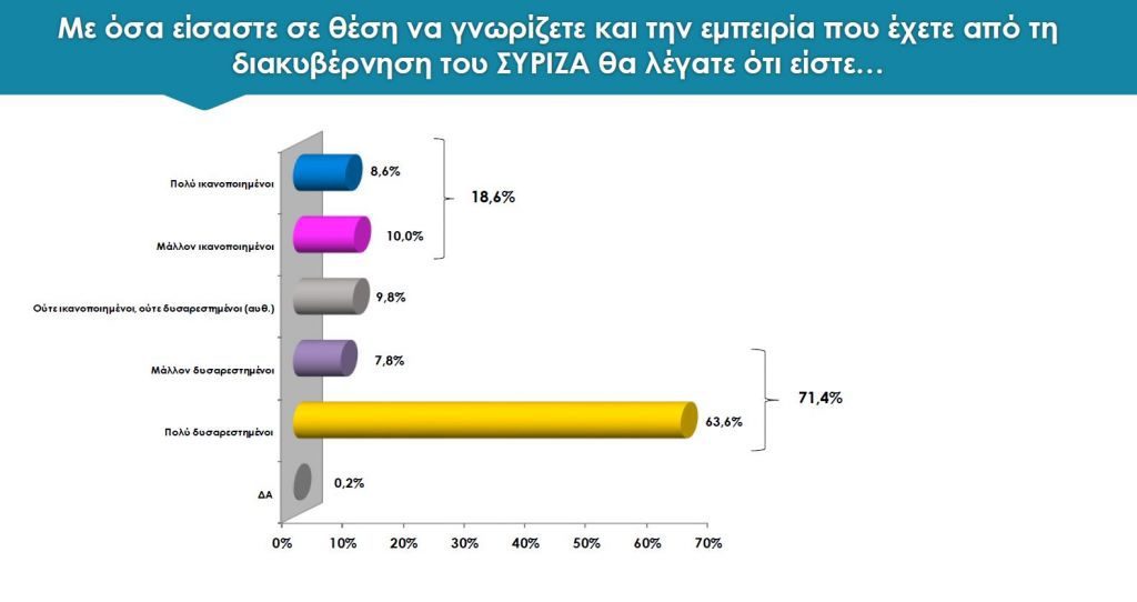 Στην ερώτηση «με όσα είσαστε σε θέση να γνωρίζετε και την εμπειρία που έχετε από τη διακυβέρνηση του ΣΥΡΙΖΑ, το 71,4% δηλώνει ότι είναι πολύ δυσαρεστημένο ή μάλλον δυσαρεστημένο ενώ μόλις 18,6%δηλώνει πολύ ή μάλλον ικανοποιημένο.