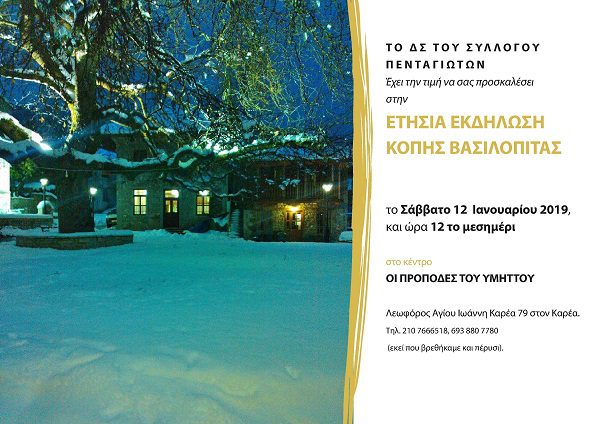Κοπή πίτας του Συλλόγου Πενταγιωτών στις 12 Ιανουαρίου ΚΟΙΝΩΝΙΚΑ Από doridanews Στις Ιαν 2, 2019 Share - Διαφήμιση -Χρόνος ανάγνωσης: 1 λεπτό Συνεχίστε να διαβάσετε- Διαφήμιση - Share