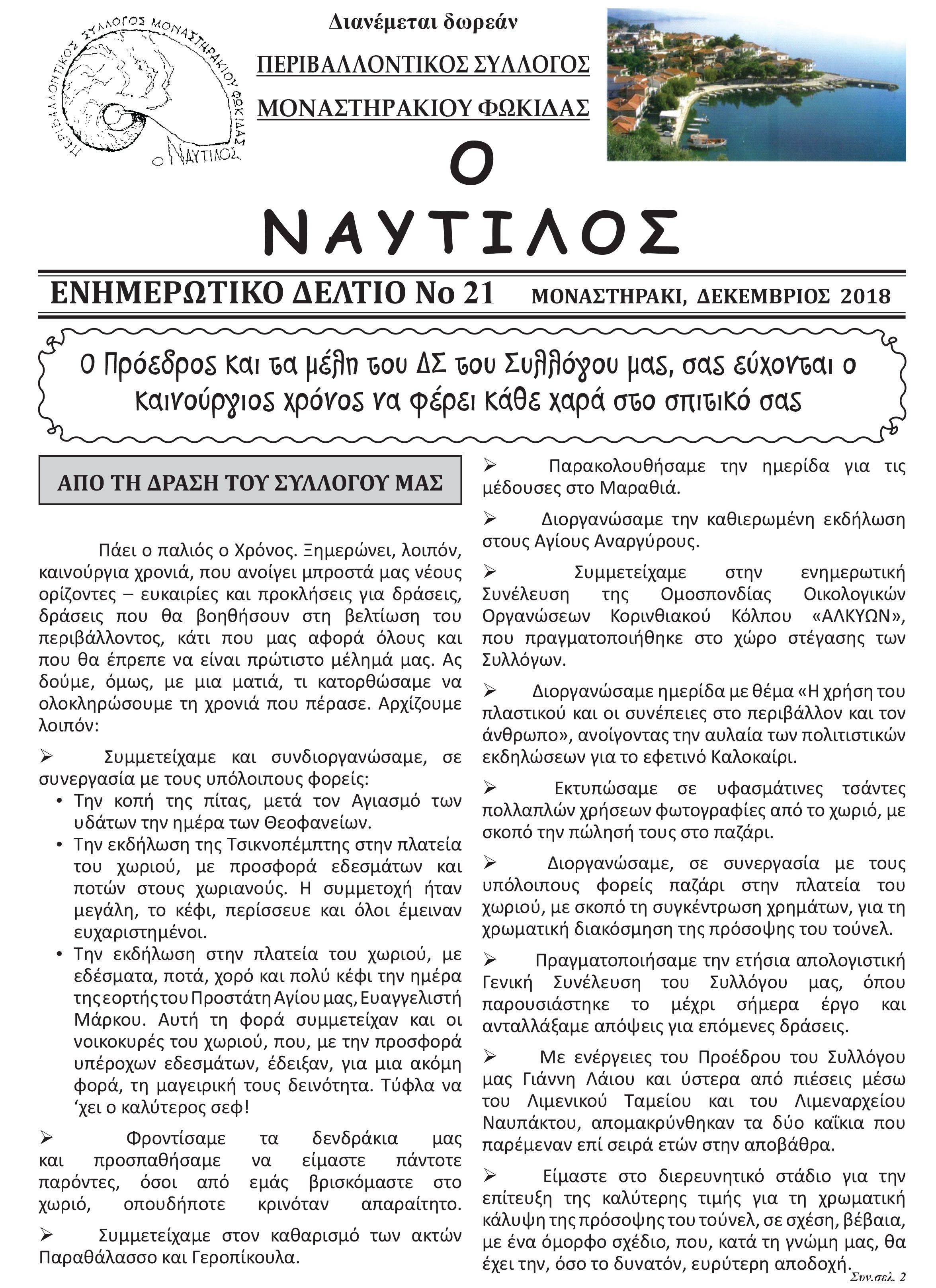 Κυκλοφόρησε το τελευταίο τεύχος Δεκεμβρίου της περιοδικής έκδοσης Ο ΝΑΥΤΙΛΟΣ που εκδίδει ο ομώνυμος Περιβαλλοντικός Σύλλογος Μοναστηρακίου Δωρίδας.