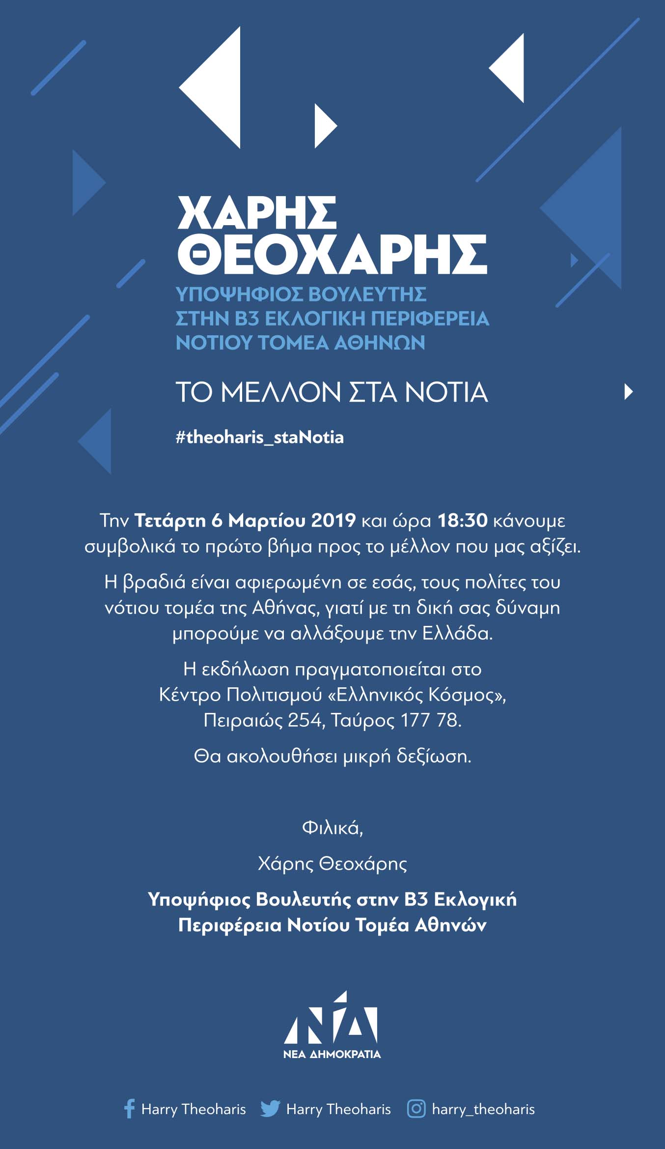 Εκδήλωση – ομιλία την Τετάρτη του βουλευτή της Ν.Δ. από τη Δωρίδα Χάρη Θεοχάρη ΠΟΛΙΤΙΚΑ Από doridanews Στις Μαρ 4, 2019 Share - Διαφήμιση -Χρόνος ανάγνωσης: 1 λεπτό Συνεχίστε να διαβάσετε- Διαφήμιση - Share