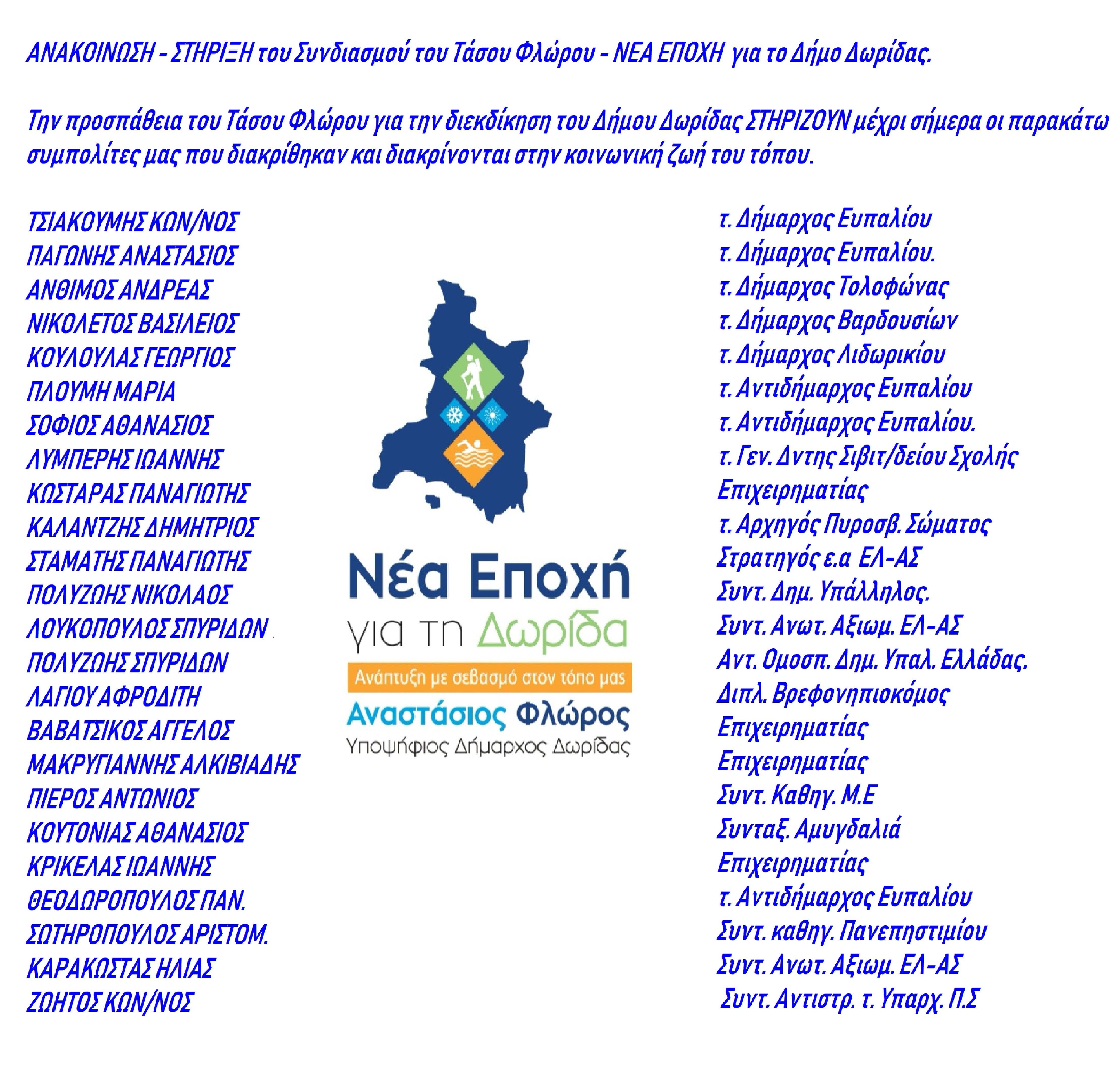 Τα ονόματα 24 συμπατριωτών της Δωρίδας που στηρίζουν τον Δημοτικό συνδυασμό “ΝΕΑ ΕΠΟΧΗ για το Δήμο Δωρίδας” του Αναστασίου Φλώρου έδωσε σήμερα στη δημοσιότητα ο Συνδυασμός.