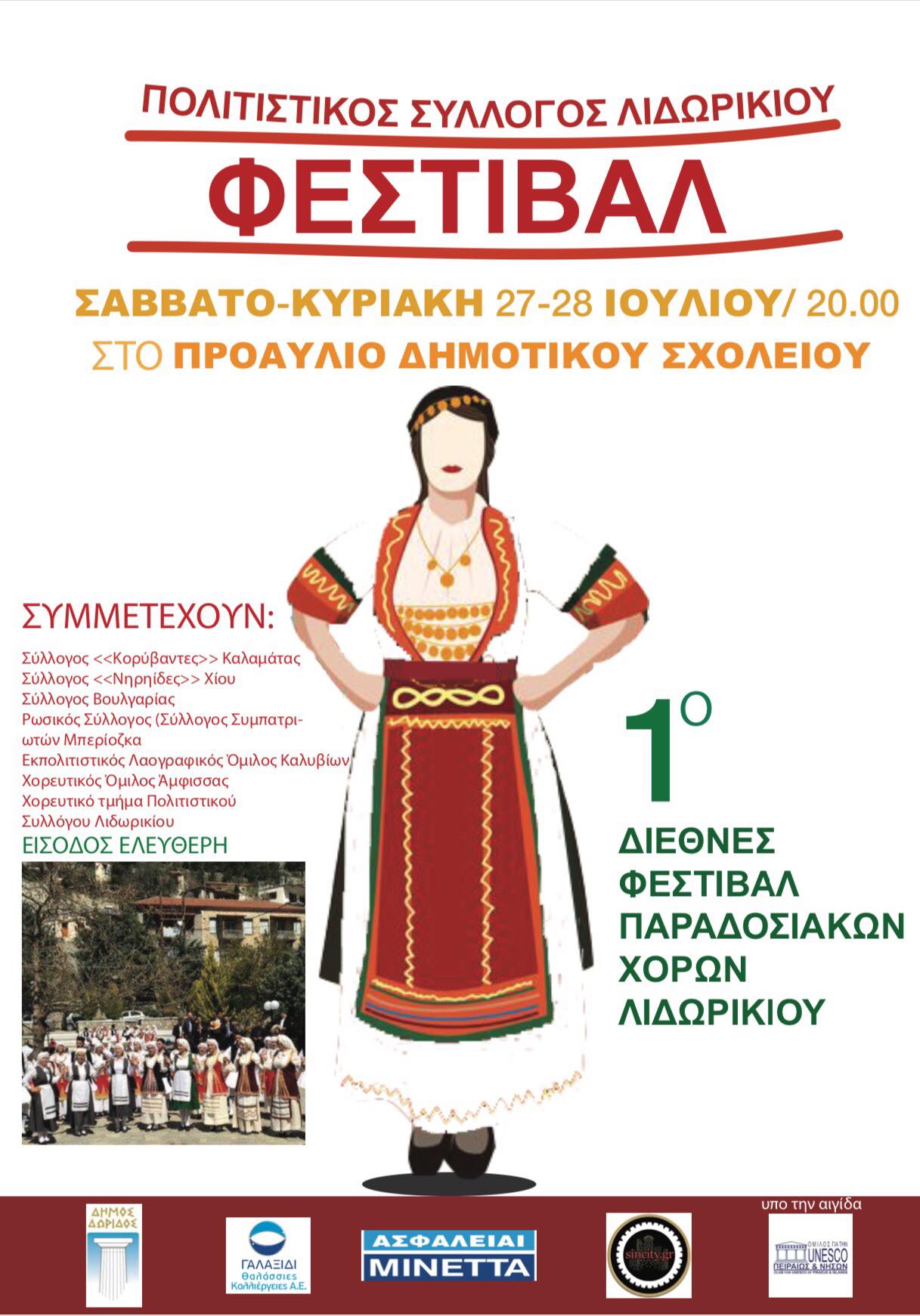 Το 1ο Διεθνές Φεστιβάλ Παραδοσιακών Χορών Λιδωρικίου διοργανώνει ο Πολιτιστικός Σύλλογος Λιδωρικίου υπό την αιγίδα του Ομίλου UNESCO Πειραιώς και Νήσων.