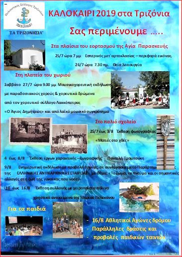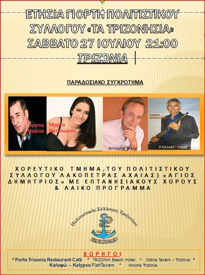 Σας ΚΑΛΟΥΜΕ, στη Μουσικοχορευτική εκδήλωση του Συλλόγουμας, που θα γίνει σταΤΡΙΖΟΝΙΑ, το Σαββάτο 27 Ιουλίου ώρα 9.00 μμ, με την ευκαιρία του εορτασμού της Αγίας Παρασκευής, που γιορτάζει στο νησί μας το ομώνυμο εκκλησάκι της, με παραδοσιακούς χορούς & χορευτικά δρώμενα από τον Ελληνικό κινηματογράφο από τον χορευτικό σύλλογο Λακκόπετρας «Ο Άγιος Δημήτριος» και από λαϊκό μουσικό συγκρότημα.