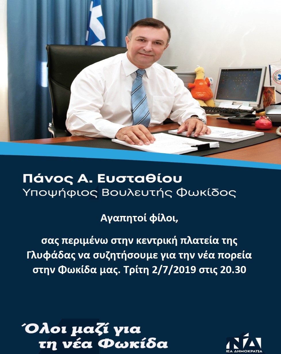 Ο Παναγιώτης Ευσταθίου συνεχίζοντας τις επαφές του με τους πολίτες της Φωκίδας θα μιλήσει σήμερα Τρίτη στη πλατεία Γλυφάδας Δωρίδας