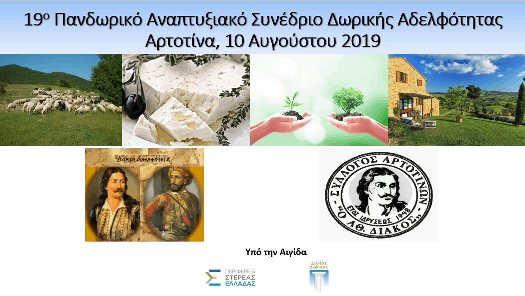 Φέτος, οι δύο ιστορικοί Σύλλογοι – η Δωρική Αδελφότητα και ο Πολιτιστικός Σύλλογος Αρτοτίνας «Ο Αθανάσιος Διάκος» – ενώνουν τις δυνάμεις τους και στις 10 Αυγούστου 2019 συνδιοργανώνουν το 19ο Πανδωρικό Συνέδριο υπό την Αιγίδα της Περιφέρειας Στερεάς Ελλάδας και του Δήμου Δωρίδας.
