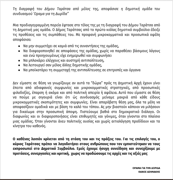 Ανακοίνωση της δημοτικής παράταξης “Όραμα για την Δωρίδα” για τη διαγραφή του Δήμου Ταράτσα ΔΗΜΟΤΙΚΑ Από doridanews Στις Νοέ 1, 2019 Share - Διαφήμιση -Χρόνος ανάγνωσης: 1 λεπτό Συνεχίστε να διαβάσετε- Διαφήμιση - Share