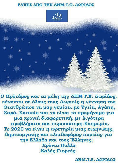 Ευχές από Δημ. Τ.Ο. Δωρίδας της Νέας Δημοκρατίας ΚΟΙΝΩΝΙΚΑ Από doridanews Στις Δεκ 19, 2019 Share - Διαφήμιση -Χρόνος ανάγνωσης: 1 λεπτό Συνεχίστε να διαβάσετε- Διαφήμιση - Share
