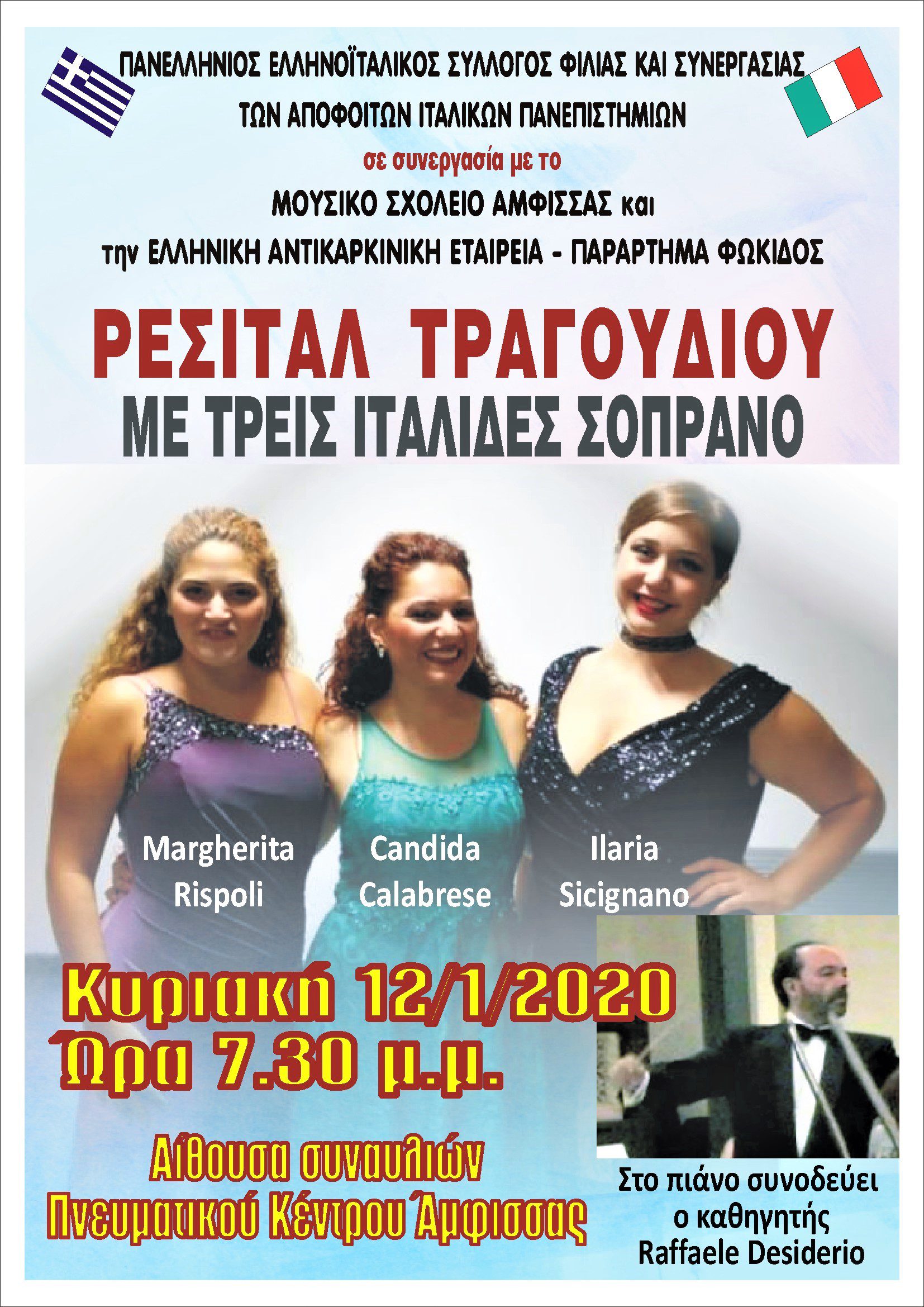 Μια εντυπωσιακή και σπάνια Συναυλία Ιταλικής Μουσικής με τρεις σπουδαίες Ιταλίδες Υψίφωνες Margherita Rispoli, Candida Calabrese και Ilaria Sicignano επί της σκηνής θα πραγματοποιηθεί την Κυριακή 12 Ιανουαρίου 2020 στις 7.30 το βράδυ στην Αίθουσα Συναυλιών του Πνευματικού Κέντρου Άμφισσας.