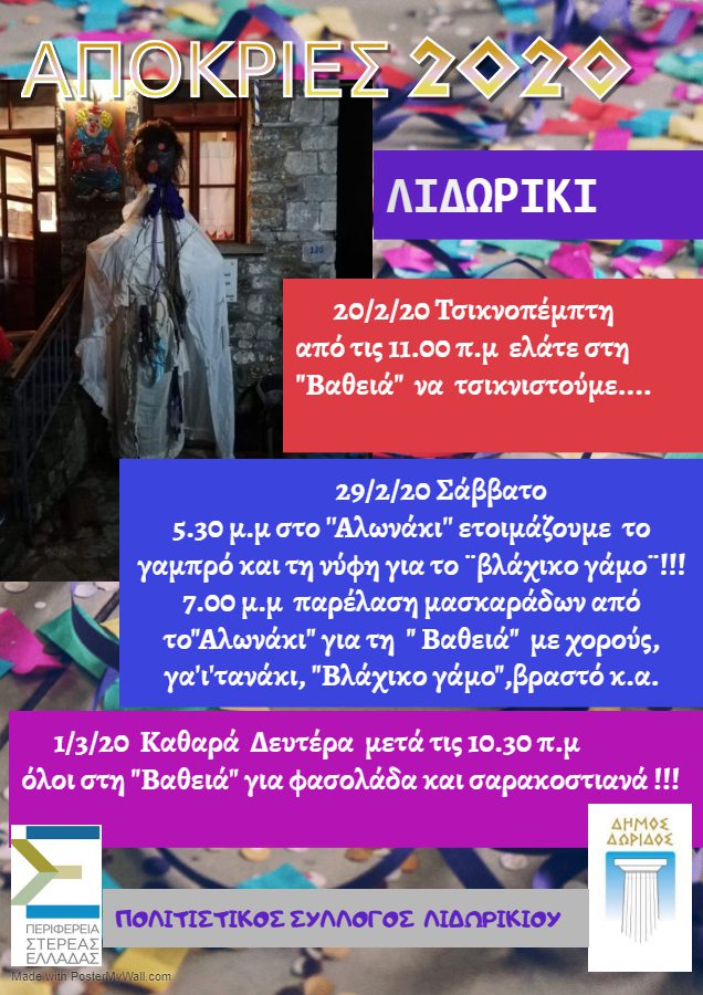 Αποκριάτικες εκδηλώσεις Πολιτιστικού Λιδωρικίου ΚΟΙΝΩΝΙΚΑ Από doridanews Στις Φεβ 15, 2020 Share - Διαφήμιση -Χρόνος ανάγνωσης: 1 λεπτό Συνεχίστε να διαβάσετε- Διαφήμιση - Share