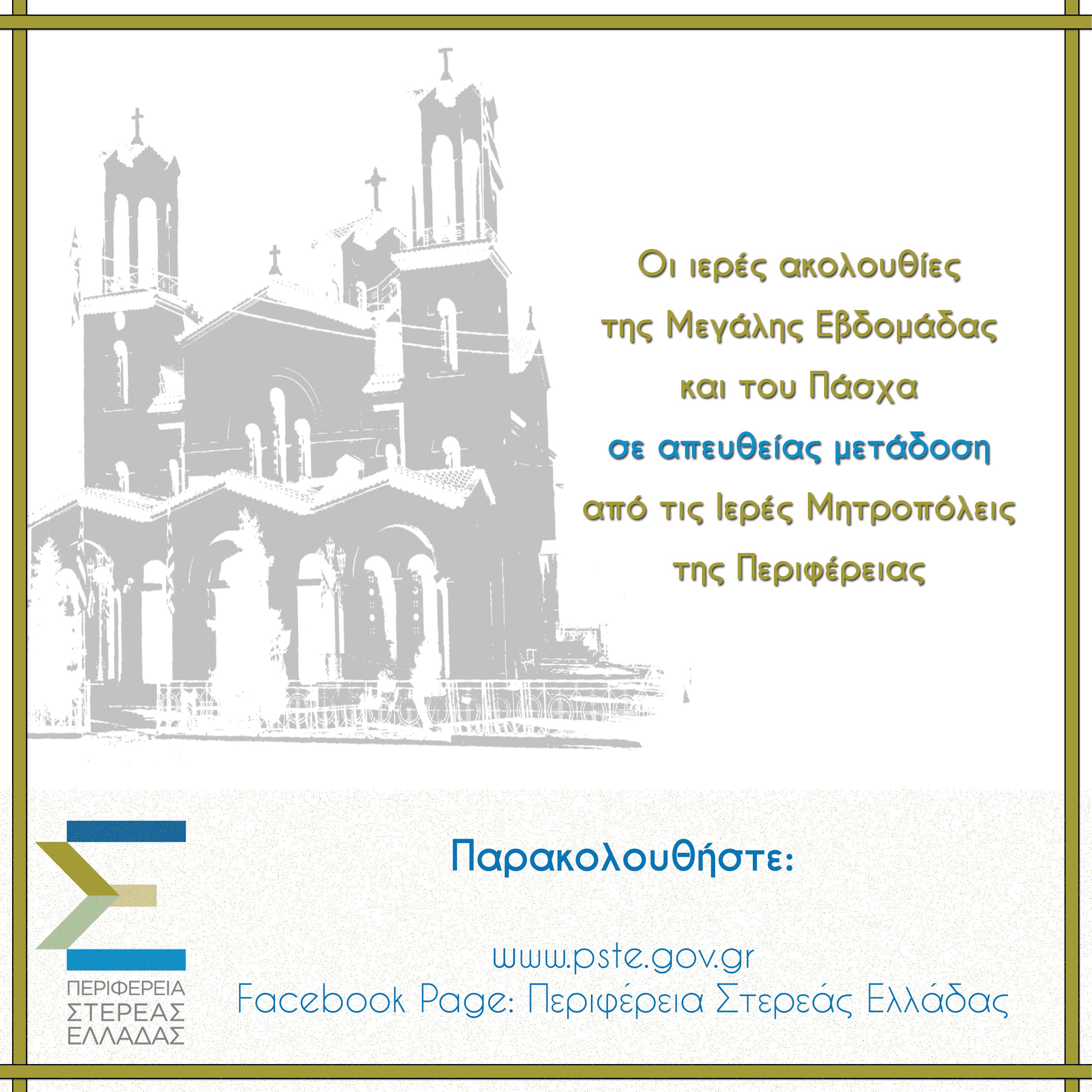 Συνεχίζονται οι απευθείας μεταδόσεις των Ιερών Ακολουθιών της Μεγάλης Εβδομάδας & του Πάσχα μέσω της ιστοσελίδας της Περιφέρειας Στερεάς Ελλάδας (https://pste.gov.gr ) σε συνεργασία με τις Ιερές Μητροπόλεις Στερεάς Ελλάδος.