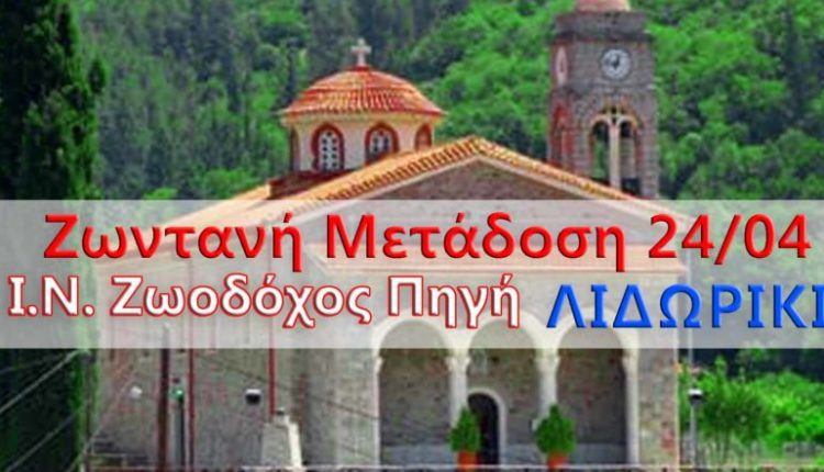 Παρακολουθήστε σήμερα Παρασκευή 24 Απριλίου στις 7:30 το πρωί σε απευθείας μετάδοση, την Πανηγυρική Θεία Λειτουργία από τον Ιερό Ναό Ζωοδόχου Πηγής στο Λιδωρίκι, από την ιστοσελίδα www.doridaSOS.gr