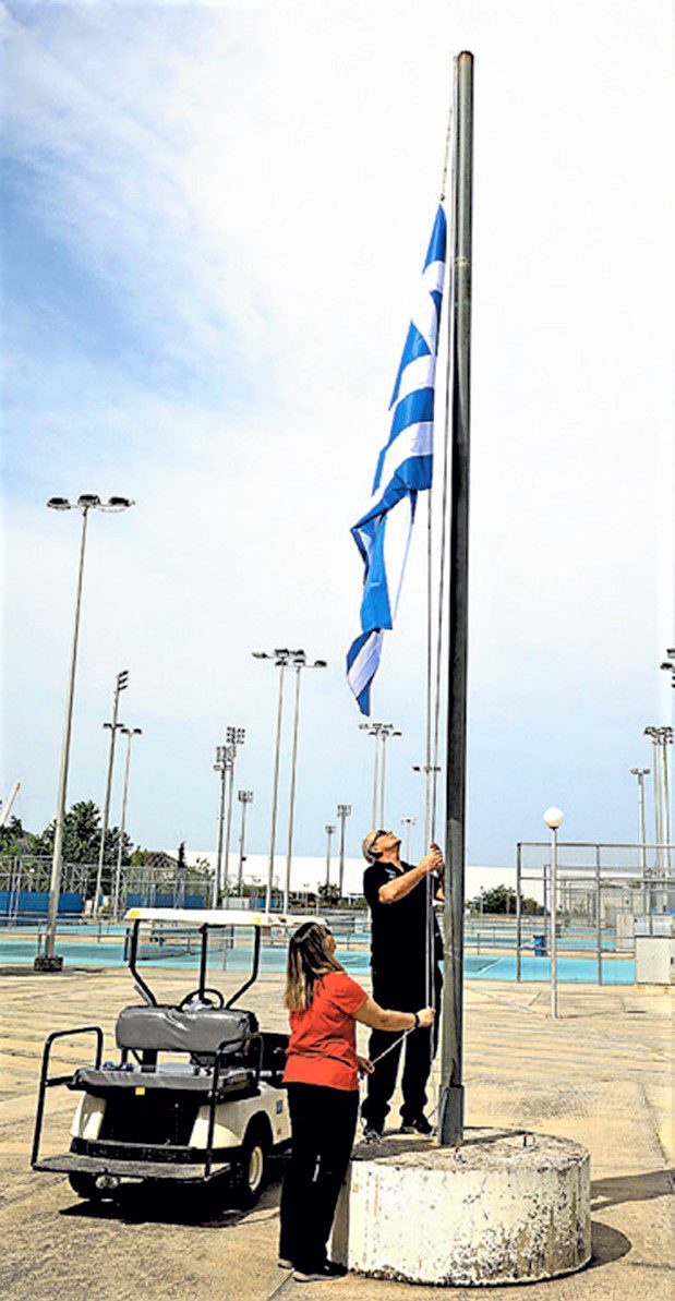 Ανάμεσα στις πρώτες παρεμβάσεις ήταν και η επανατοποθέτηση σημαιών στα κοντάρια τους. «Για μένα η σημαία δείχνει κάτι, ότι ο χώρος είναι ζωντανός». Μάλιστα, τοποθετήθηκε ξανά σημαία στο κοντάρι 23 μέτρων όπου το 2004 ανέμιζε η σημαία των Ολυμπιακών Αγώνων. «Όταν έληξαν οι Αγώνες, κατέβηκε η σημαία και αυτό ήταν. Από το ’04 δεν έχει ξαναμπεί. Όταν βάλαμε εμείς μια σημαία έξι μέτρων, μας πήραν οι περίοικοι και ρώταγαν τι συμβαίνει. Αν υπάρχει κάποια εκδήλωση. Από μια σημαία. Μην ξεχνάμε ότι πρόκειται για τη μεγαλύτερη αθλητική εγκατάσταση της χώρας και μία από τις μεγαλύτερες στην Ευρώπη».