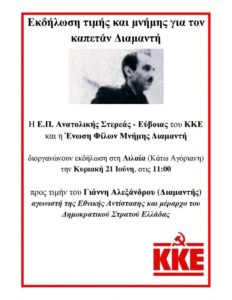 Εκδήλωση μνήμης και τιμής στον Καπετάν Διαμαντή (Γιάννη Αλεξάνδρου), διοργανώνουν η ΕΠ Ανατολικής Στερεάς και Εύβοιας του ΚΚΕ, η ΠΕΑΕΑ-ΔΣΕ και η Ένωση Φίλων Μνήμης Διαμαντή, σήμερα  Κυριακή 21 Ιουνίου,  στις 11 το πρωί, στη Λιλαία Φωκίδας.