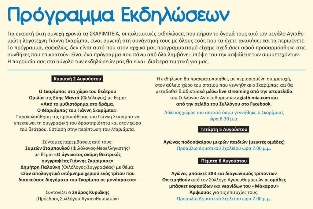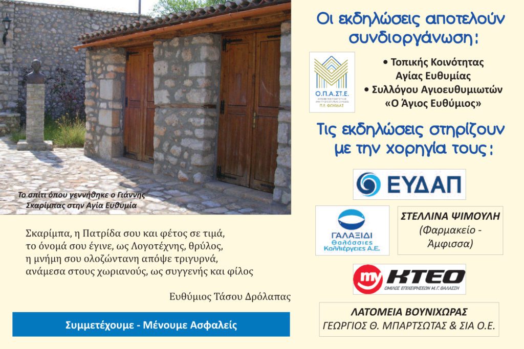Σας παρουσιάζουμε το πλήρες πρόγραμμα των εκδηλώσεων ΣΚΑΡΙΜΠΕΙΑ 2020 το οποίο είναι προσαρμοσμένο στα δεδομένα των ειδικών συνθηκών που βιώνει ολόκληρος ο πλανήτης. Τα ΣΚΑΡΙΜΠΕΙΑ θα πραγματοποιηθούν για 26η συνεχή χρονιά στην Αγία Ευθυμία, την γενέτειρα του Γιάννη Σκαρίμπα και διοργανώνονται από τον Οργανισμό Πολιτιστικής Ανάπτυξης Στερεάς Ελλάδας (ΟΠΑΣΤΕ), την Κοινότητα Αγίας Ευθυμίας και τον Σύλλογο Αγιοευθυμιωτών “Ο Άγιος Ευθύμιος”.