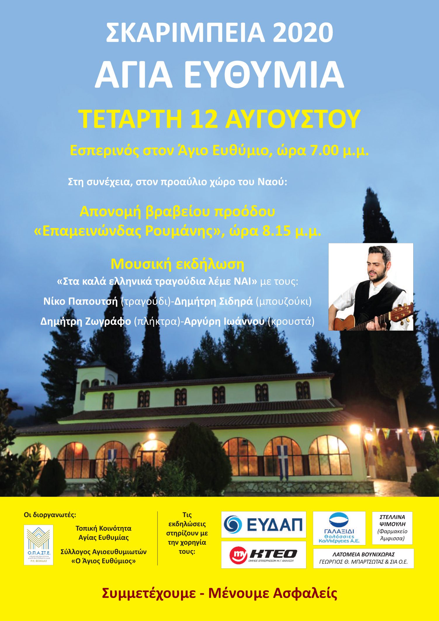 Με παράκληση στον Άγιο Ευθύμιο, απονομή βραβείου «Επ. Ρουμάνης» και μουσική εκδήλωση με τον Νίκο Παπουτσή συνεχίζονται την Τετάρτη 12 Αυγούστου τα ΣΚΑΡΙΜΠΕΙΑ 2020 στην Αγία Ευθυμία